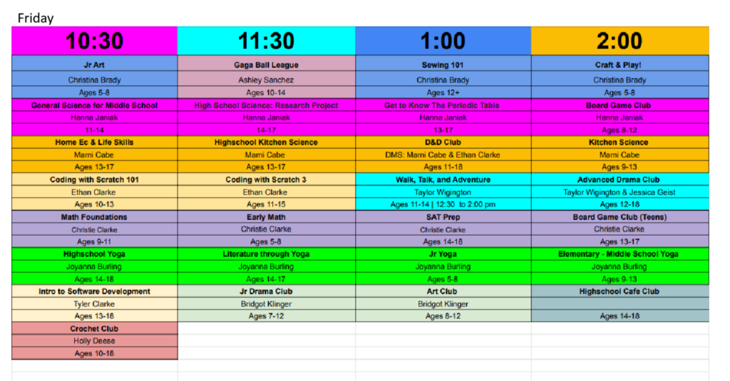 On Fridays, it’s fun for all ages! Our classes and clubs vary widely.  From Crochet Club to Cooking to Art to Math – It’s our hope that our class and club offerings will allow for students to create a schedule that allows them to explore new interests, meet friends, and learn from skilled and caring individuals from the local homeschooling community.