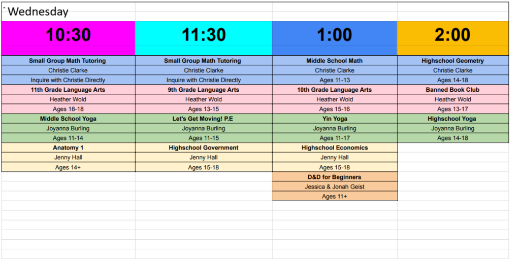 Wednesdays will be for ages 11+ only. We have a variety of curricula backed learning groups, hands-on science like anatomy and psychology – and electives such as yoga.